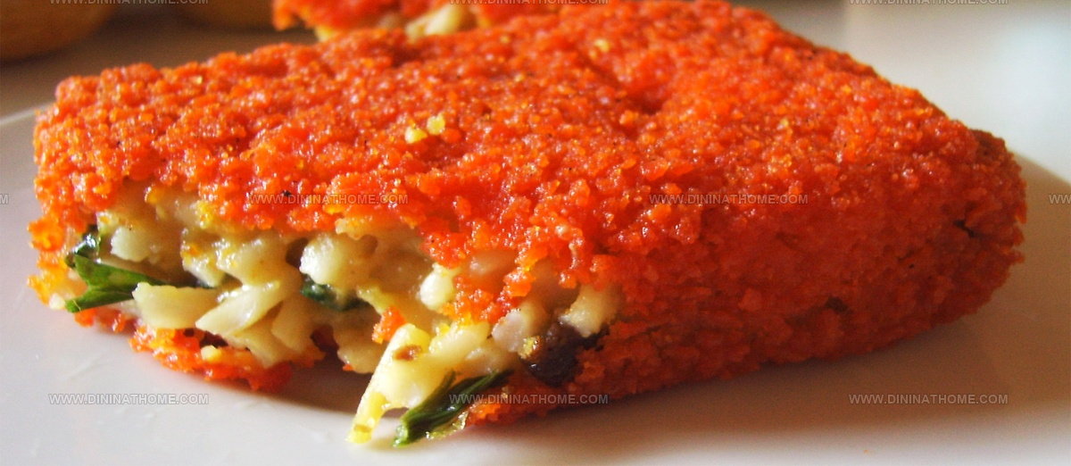 Breadcrumb coating provides a golden, crunchy exterior that contrasts with soft noodle interior.