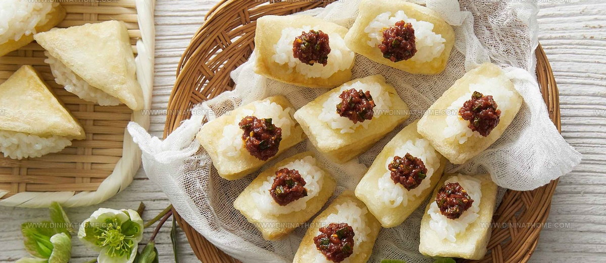 Crispy fried tofu slices serve as delicate wrappers holding warm rice mixtures inside their golden-brown shells.