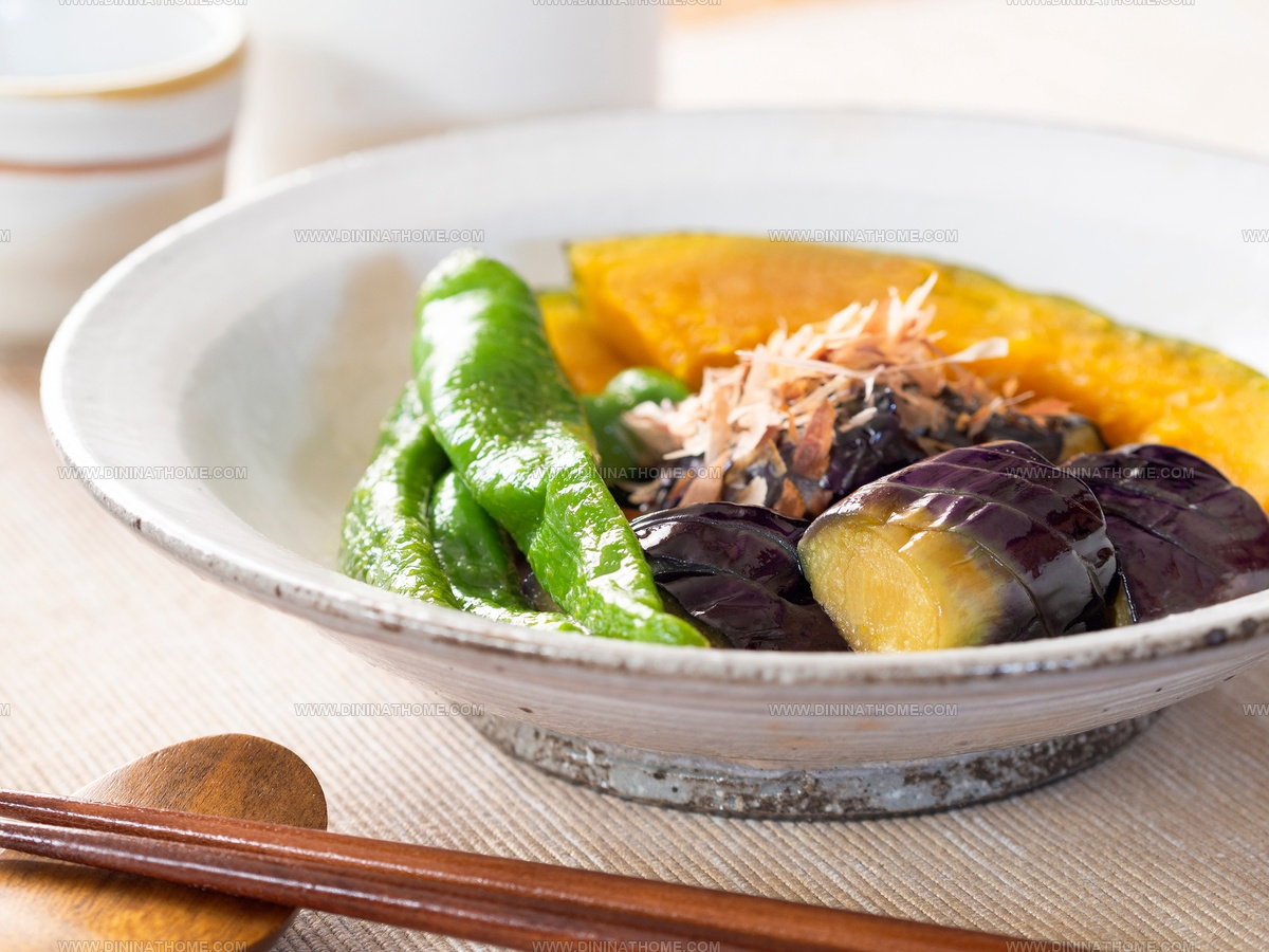Vegetable pieces absorb a savory marinade blending dashi, soy sauce, mirin, and rice vinegar after initial frying.