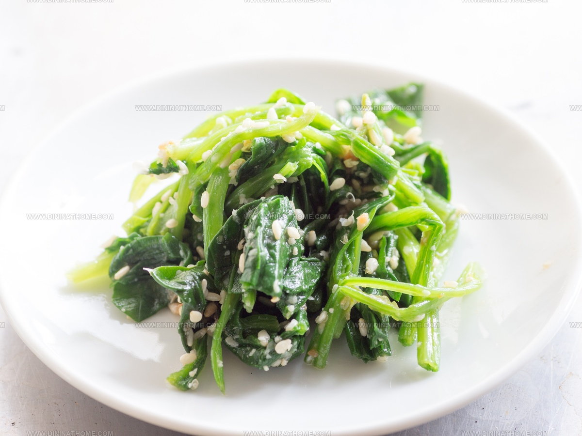 Sesame paste and soy sauce create a rich, umami-packed coating that clings to each spinach strand.
