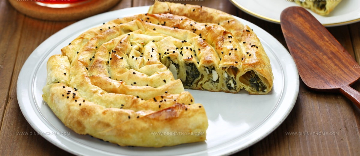 Sirnica represents a rustic Bosnian cheese pie crafted with delicate phyllo dough and wrapped in a signature spiral technique.