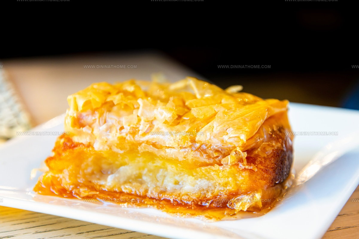 Greek bakeries craft this dessert by carefully brushing phyllo with melted butter and filling it with smooth, silky custard.