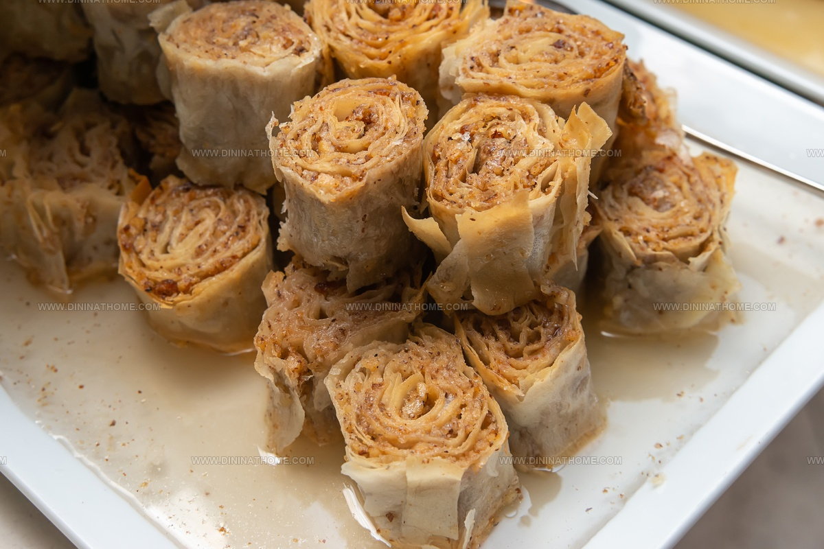Once baked, the pastry receives a generous pour of sugar syrup, which seeps into every layer.