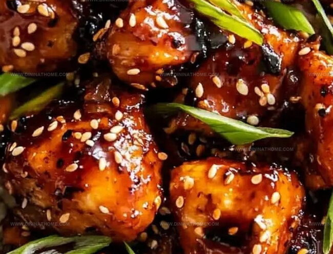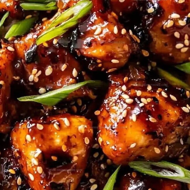 Tender chicken pieces glisten with a rich, golden-brown sauce that promises instant satisfaction.