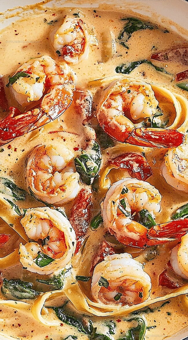 This recipe combines classic Italian flavors with creamy sauce, succulent shrimp, and vibrant ingredients like sun-dried tomatoes and spinach, creating a restaurant-quality meal at home.