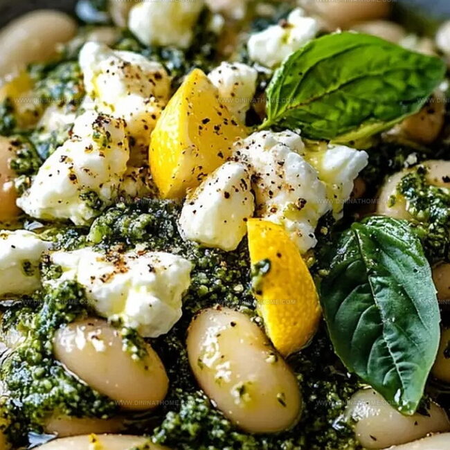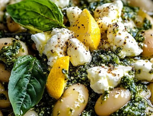 - Cascade the freshly crafted basil pesto over the beans and ricotta, allowing the emerald sauce to weave between the ingredients.