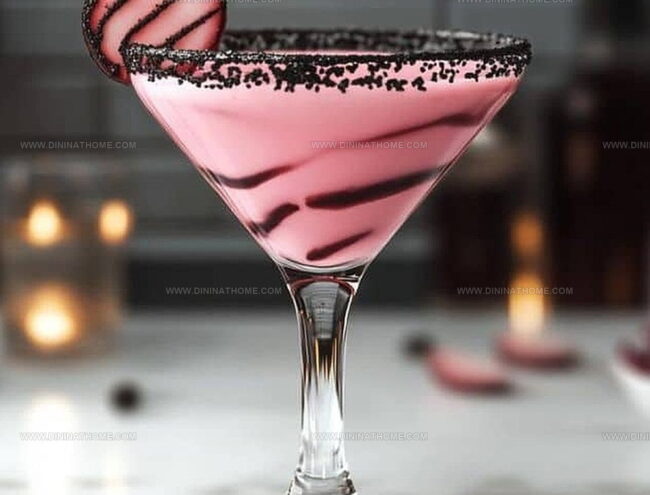 Carefully strain the vibrant mixture into your prepared chilled and chocolate-rimmed martini glass.