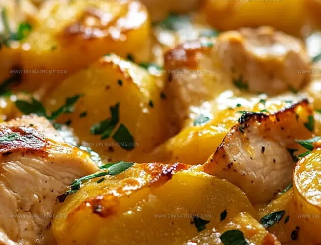 Crispy golden edges elevate this hearty chicken and potato bake into a comfort food symphony.