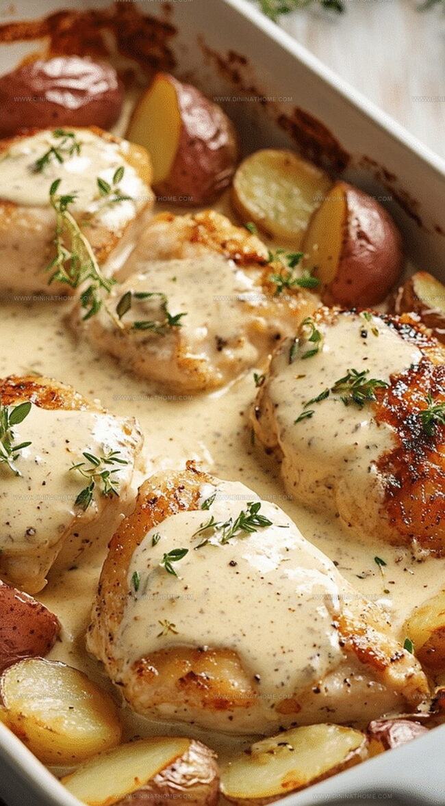 Serve hot and enjoy the mouthwatering combination of crispy chicken, creamy sauce, and perfectly roasted potatoes.