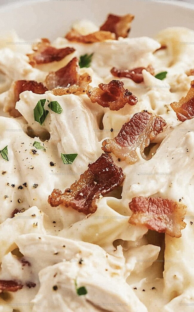 Crispy bacon pieces dance with tender chicken chunks in a creamy ranch-infused sauce.