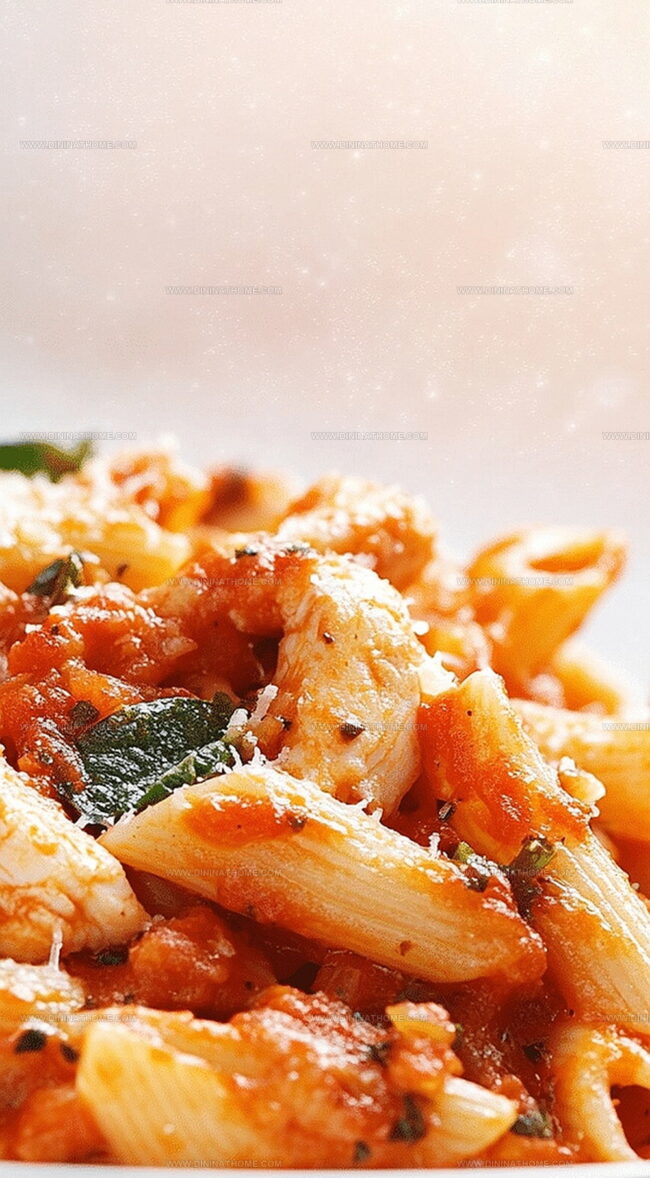 - Reunite the perfectly cooked pasta and seared chicken with the robust tomato sauce, delicately tossing to ensure complete coating.