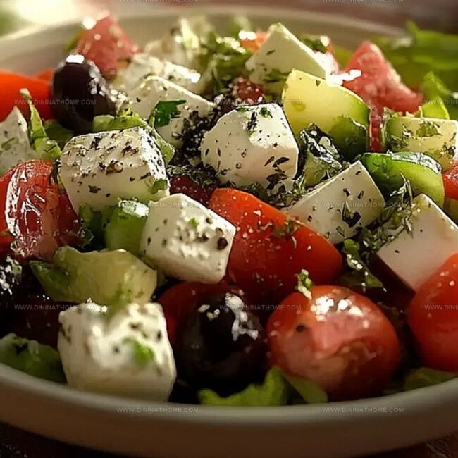 - Optional: Briefly toss the salad to integrate flavors, taking care not to disrupt the feta’s elegant whole-block appearance.