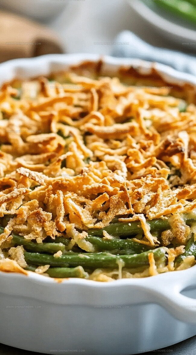 Tender green beans nestled between creamy sauce and crispy onion toppings create a timeless comfort dish.