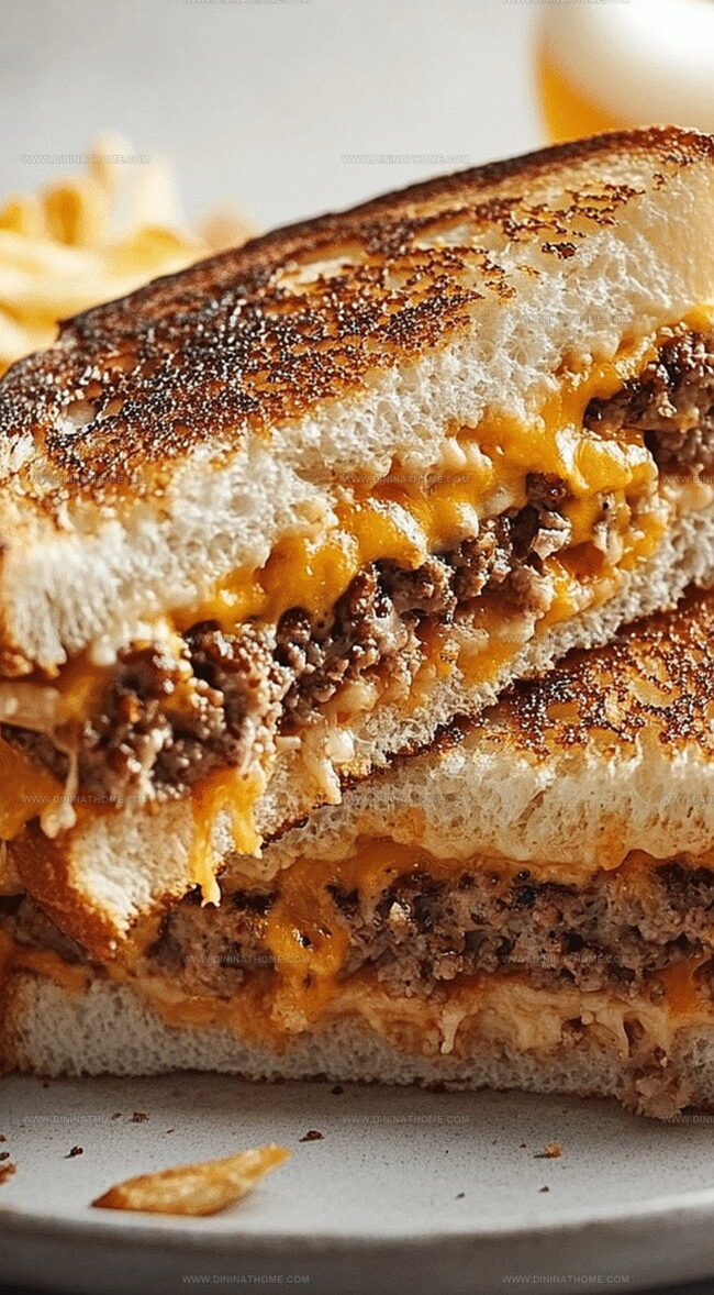 - Slice the patty melt diagonally, creating two triangular halves, and serve immediately while still piping hot and perfectly melted.