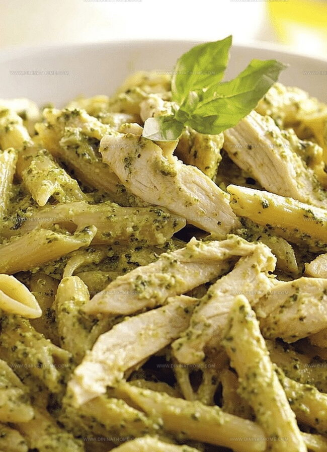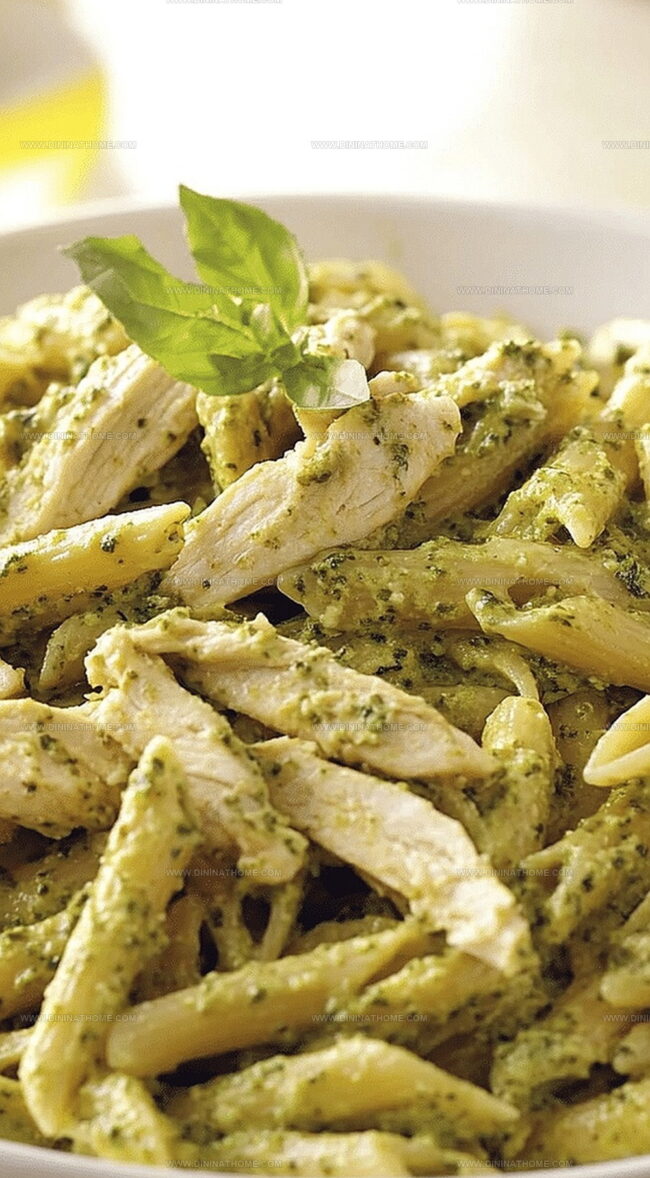 Rich, verdant pesto blends seamlessly with tender chicken pieces, promising a meal you’ll want to savor.