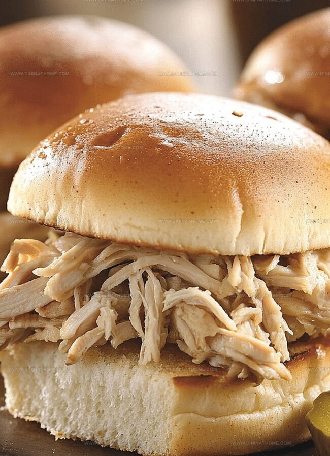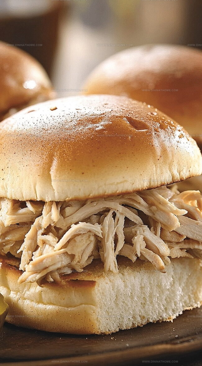 Tender shredded chicken nestles perfectly between soft rolls, creating magic in every bite.
