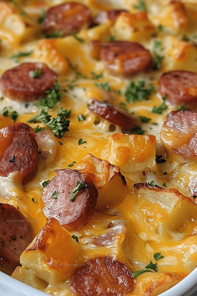 Layers of golden potatoes mingle with smoky sausage chunks for an irresistible combination.