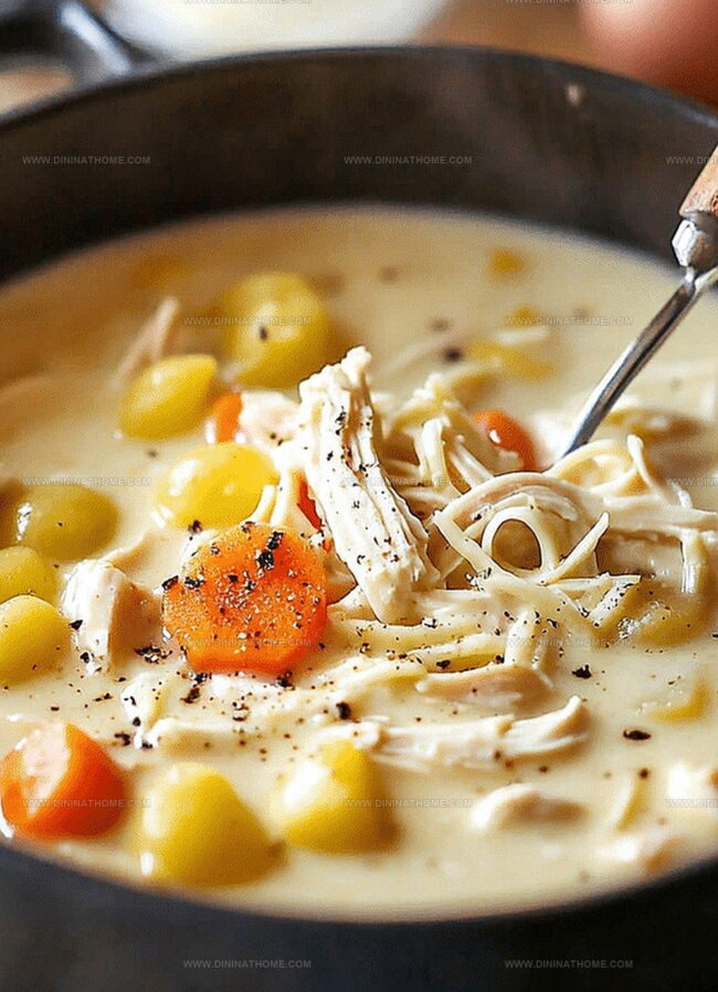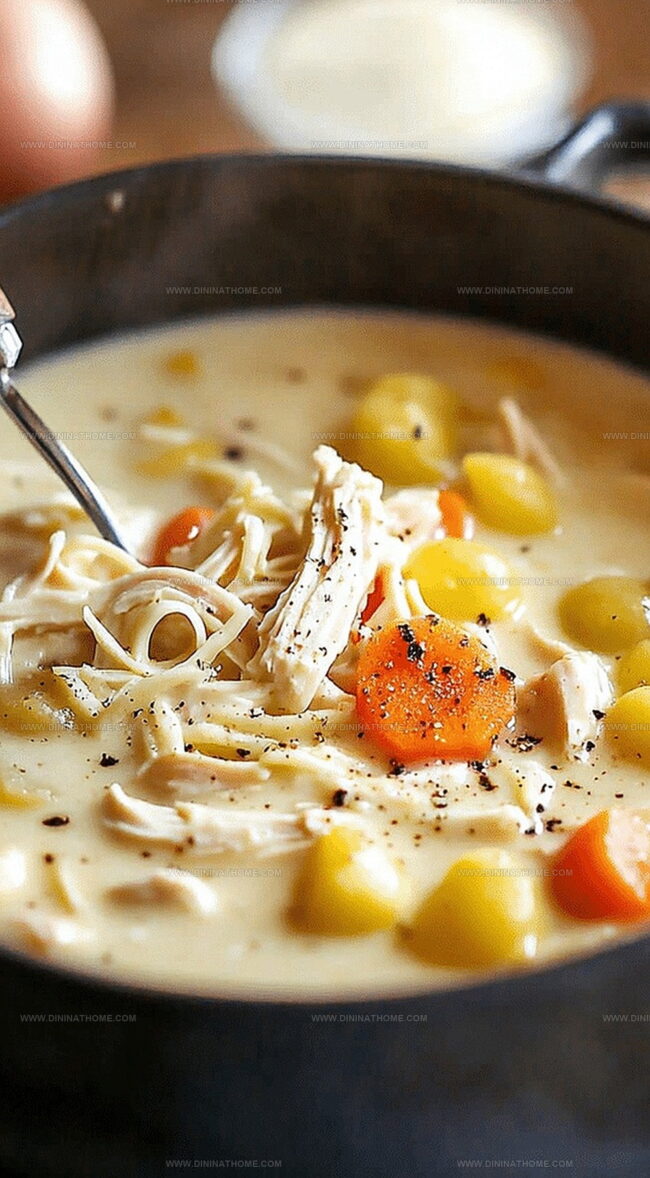 Rich, velvety broth swirls around tender chicken and soft noodles, creating magic in a bowl.