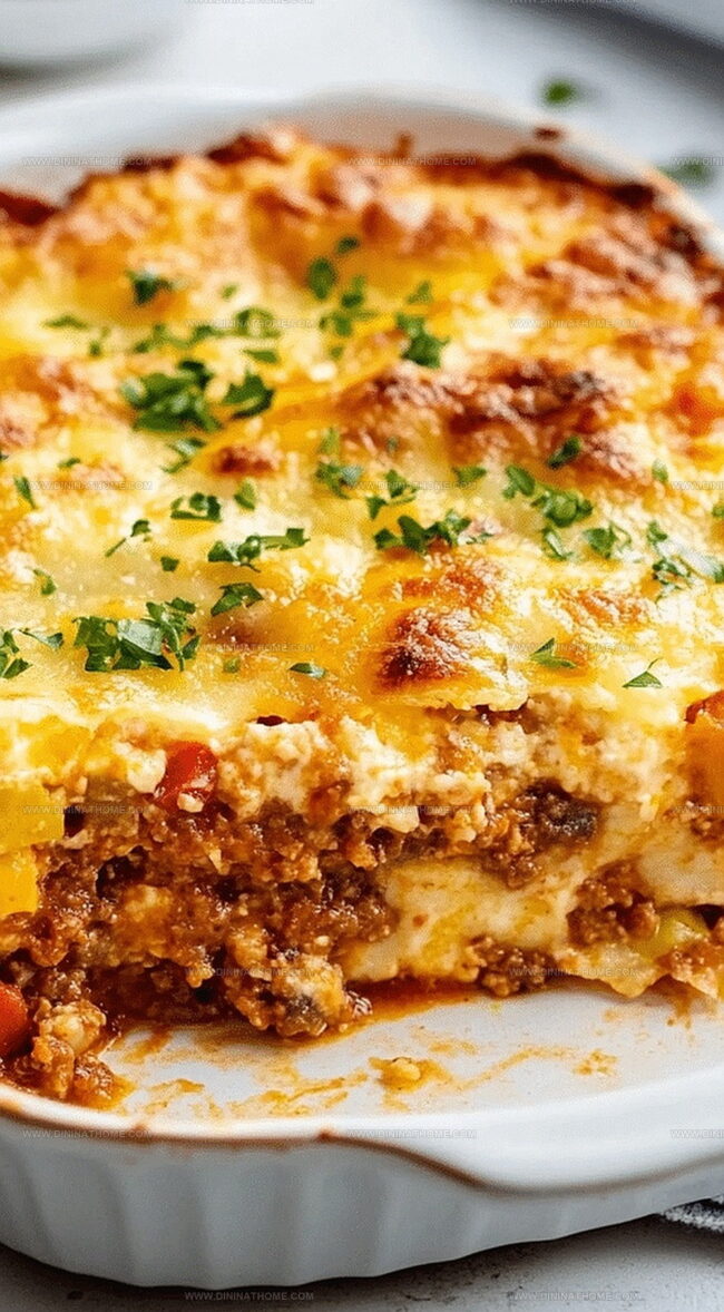 - Place the casserole in the preheated oven and bake until the cheese is fully melted, bubbling, and develops a golden-brown crust.