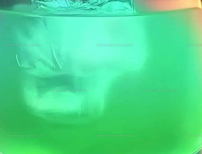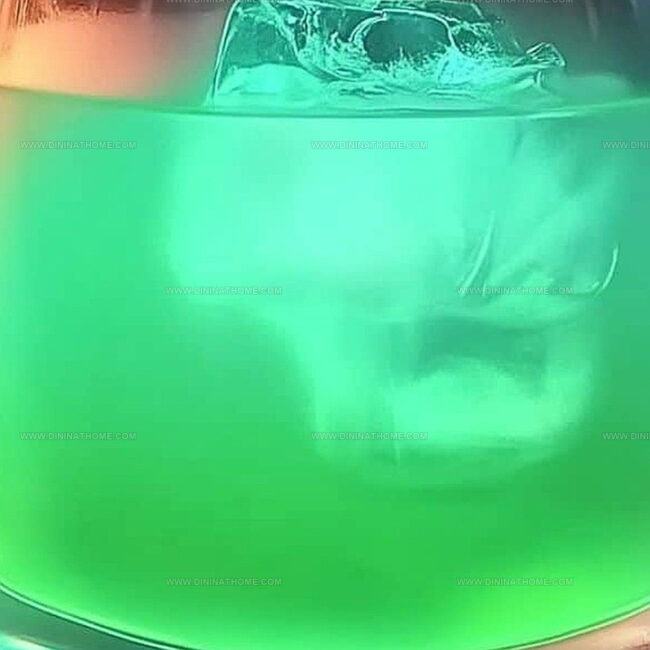 - Position a strainer atop the shaker and cascade the electric green concoction into a glass packed with fresh ice cubes.