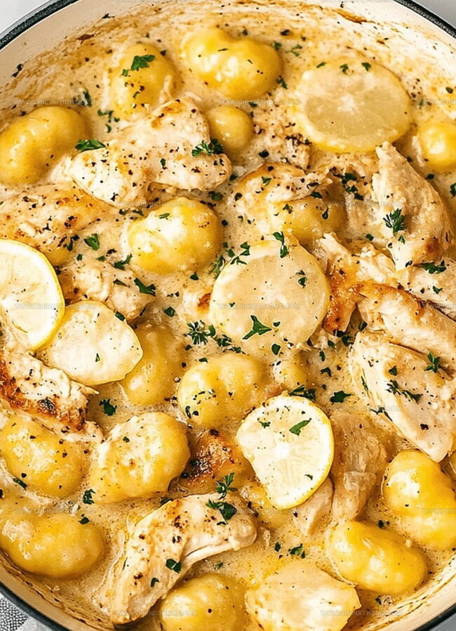 Crispy edges of gnocchi provide delightful texture against juicy chicken chunks.