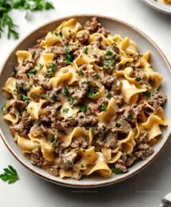 Hearty ground beef stroganoff brings rustic comfort straight from Eastern European kitchens to dinner tables. Rich creamy sauce and tender beef nestled over egg noodles create a satisfying meal you’ll crave again and again.