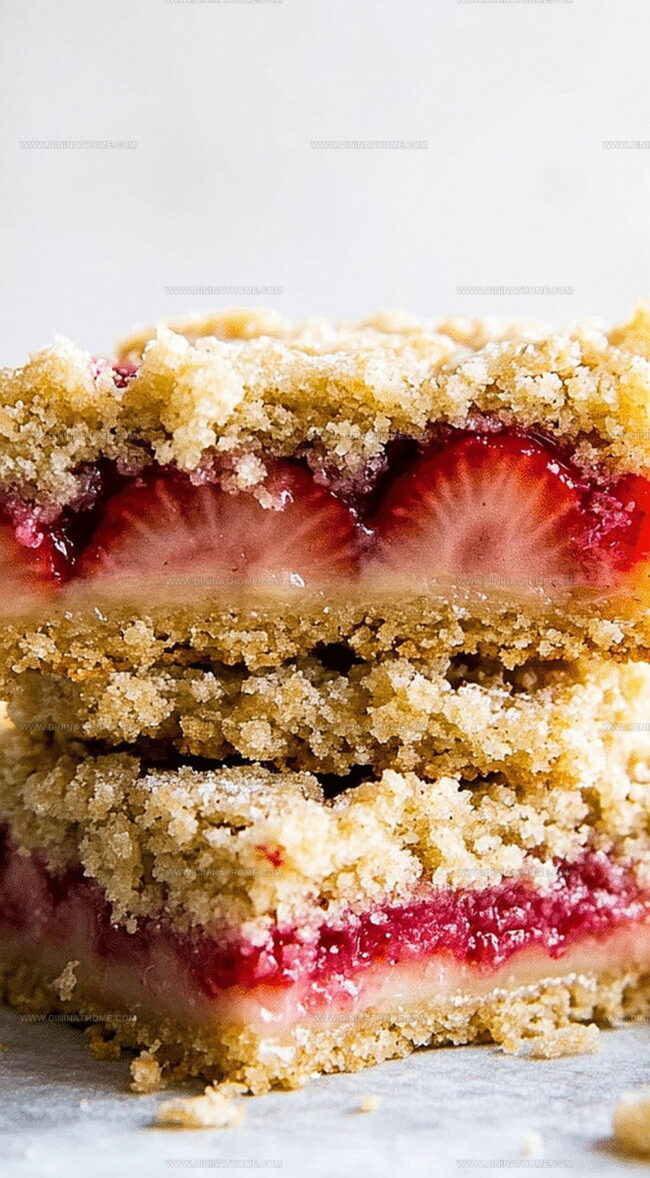 - Once cooled, slice into individual bars and serve, revealing the beautiful layers of crumbly crust and vibrant strawberry filling.