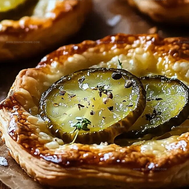 Flaky dough embraces crisp pickle slices in a delicate dance of textures.