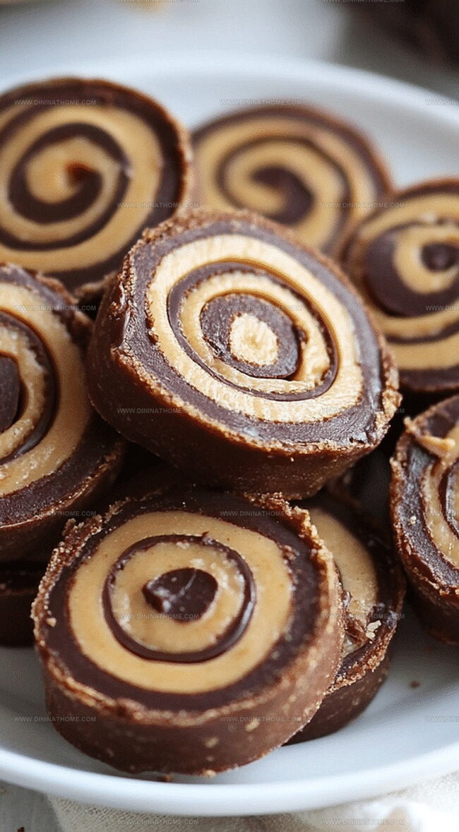 - Remove the chilled log from the refrigerator and slice into elegant pinwheel discs using a sharp knife, creating uniform medallions with distinct chocolate and peanut butter layers.