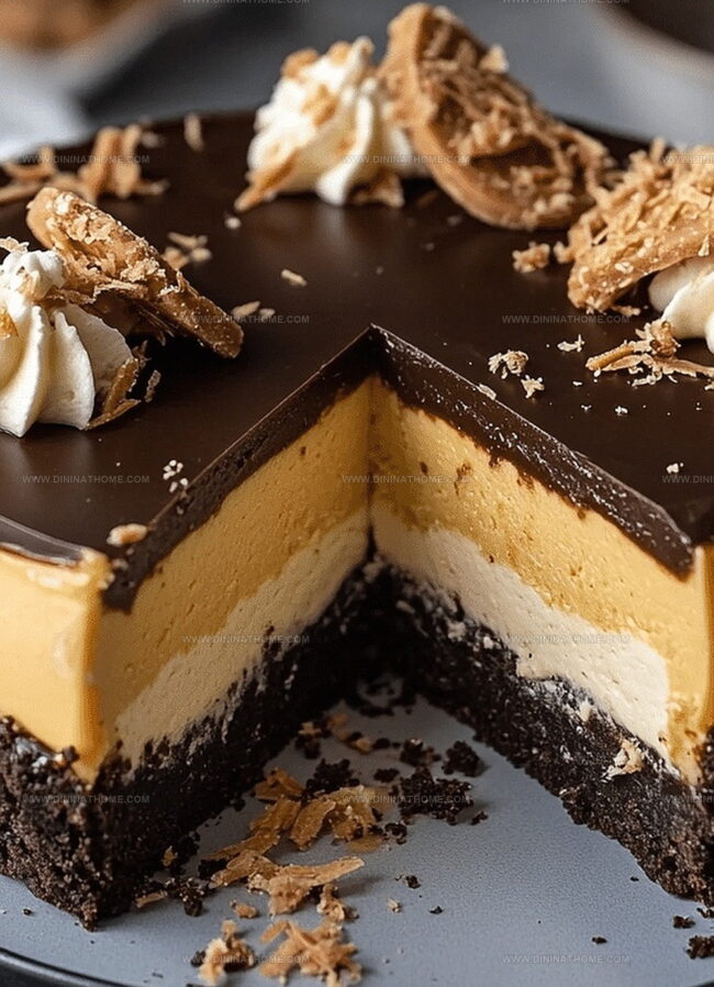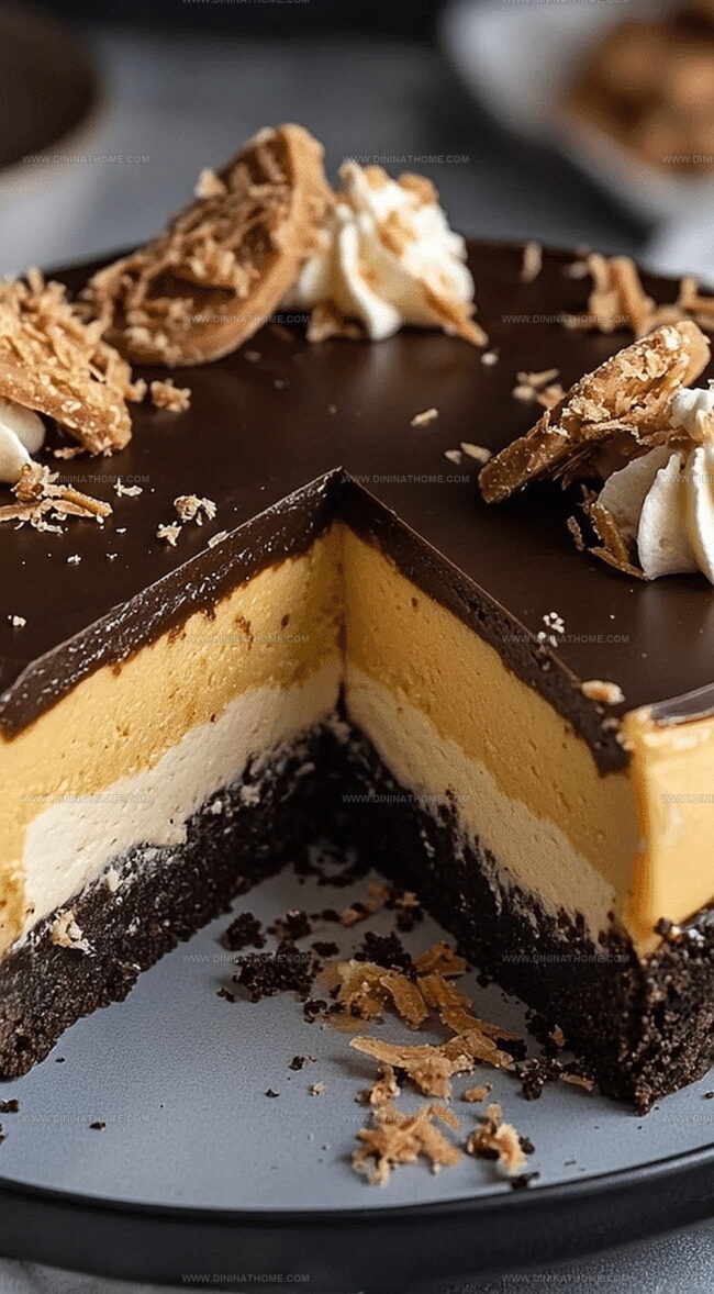 Indulge in this luxurious no-bake dessert that combines rich chocolate, creamy cheesecake, and a crunchy coconut crust.