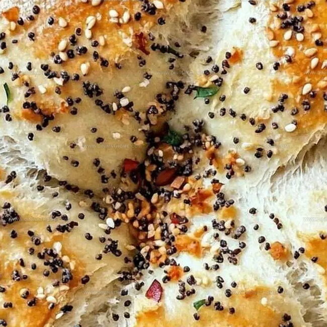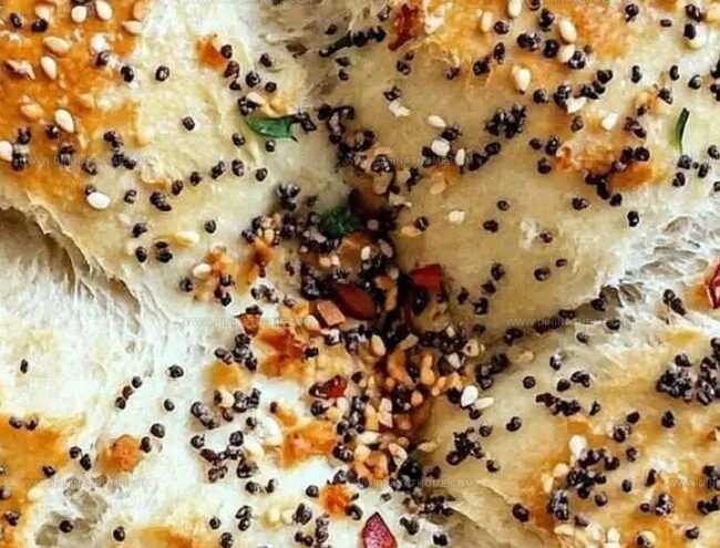 - Delicately moisten the dough’s surface with water, then lavishly dust with everything bagel seasoning. Enhance the flavor profile by sprinkling additional sesame and poppy seeds, complemented by aromatic garlic flakes.