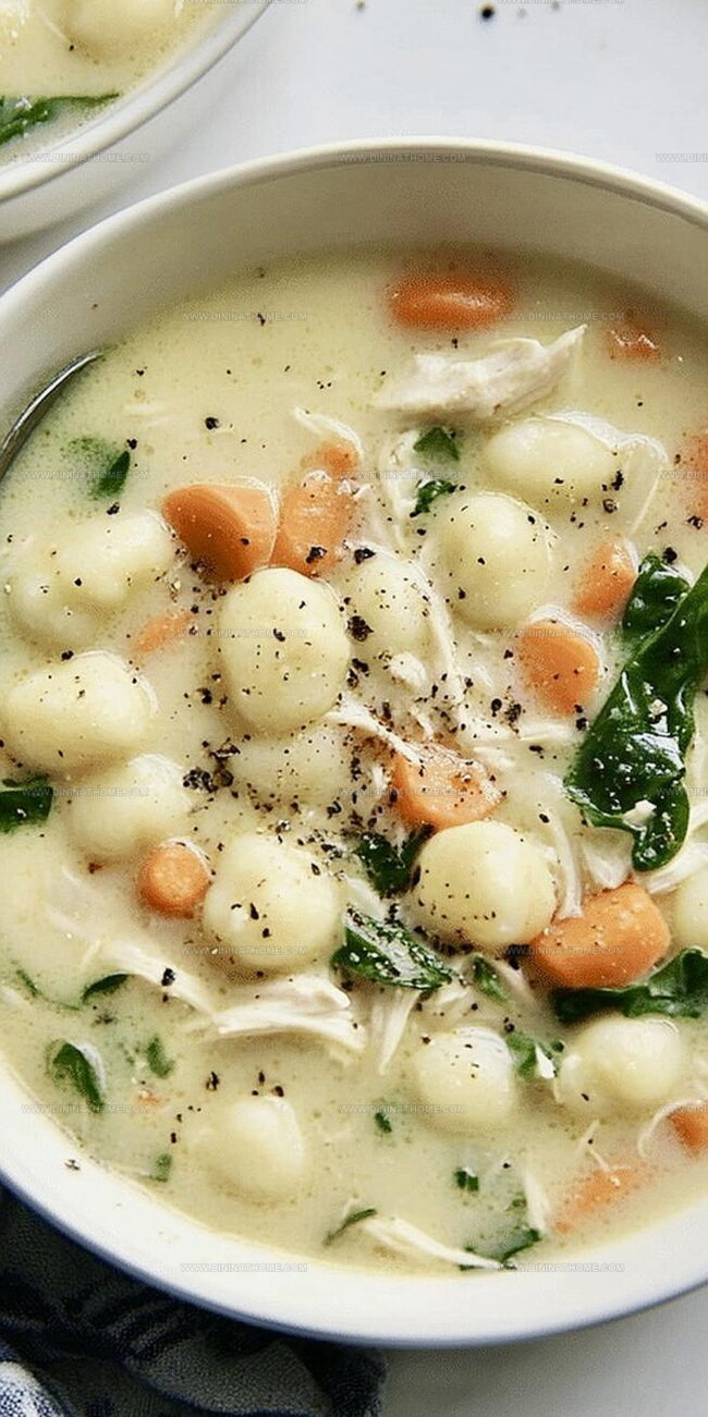 Soft potato dumplings nestle alongside tender chicken pieces in a creamy broth that whispers culinary magic.