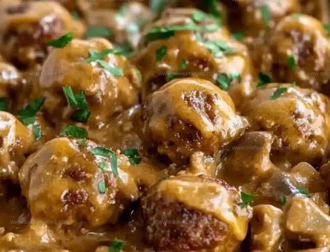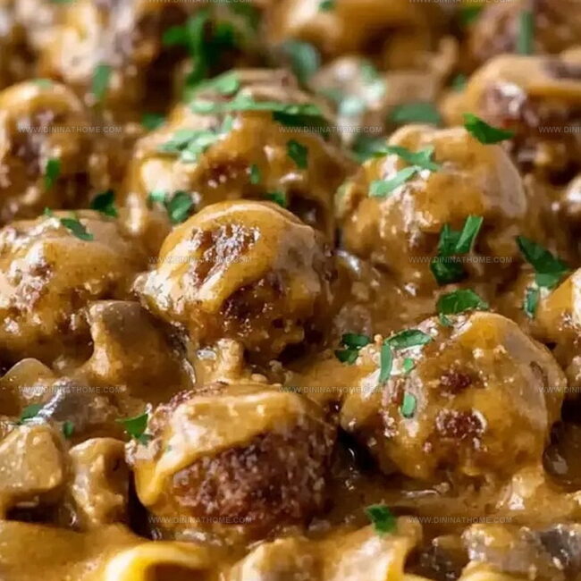 Creamy sauce envelops tender meatballs with rich, velvety elegance.