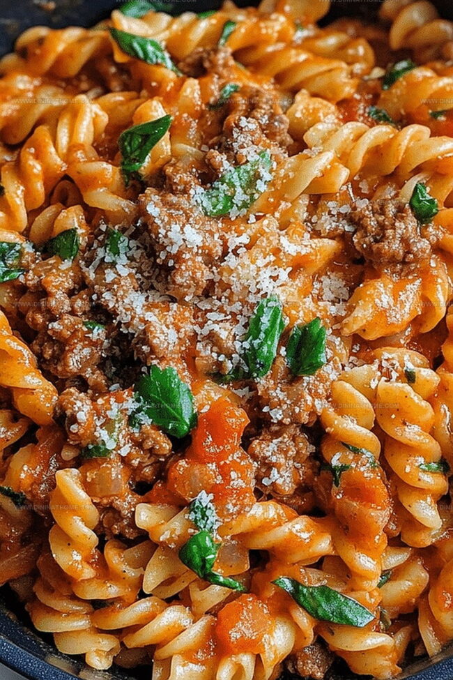 Fats and Oils:Aromatics and Flavor Enhancers:Meat and Protein:Tomato Components:Seasoning Essentials:Liquid Components:Pasta:Dairy Components:Garnish:Creamy Tomato Beef Pasta One Pot