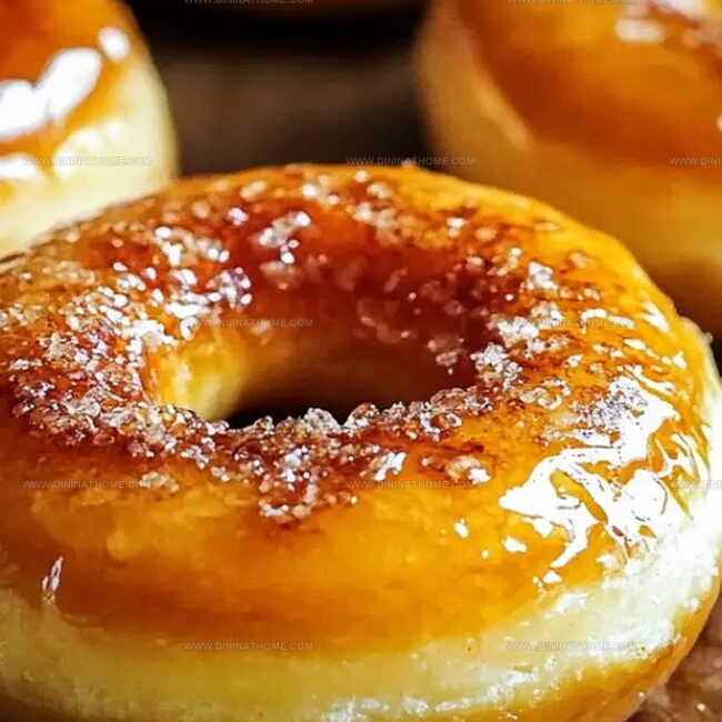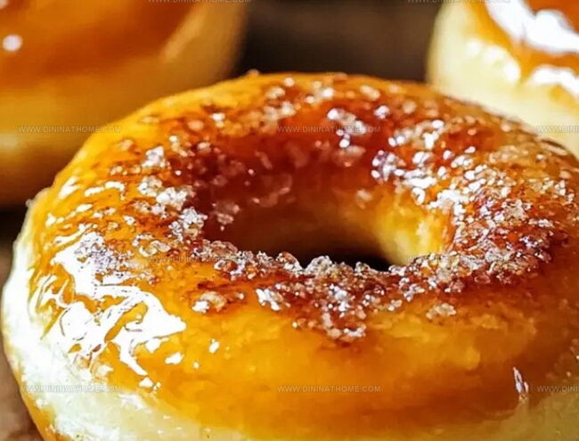 Rich, golden oven-baked donuts with a creme brulee twist offer a delightful fusion of classic French pastry and American comfort treat. Creamy vanilla custard and caramelized sugar create an indulgent dessert you’ll savor with pure culinary pleasure.