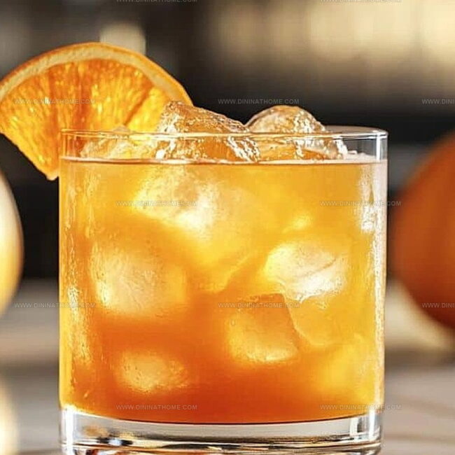 - Elegantly strain the luminous orange-hued cocktail into the prepared glass, allowing it to cascade over a bed of fresh ice.