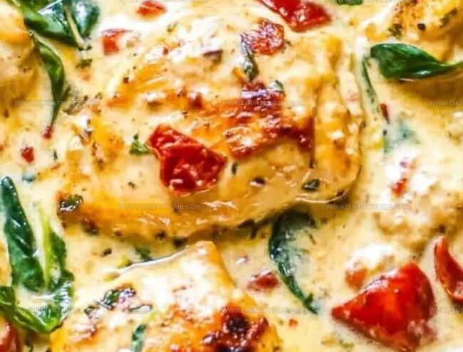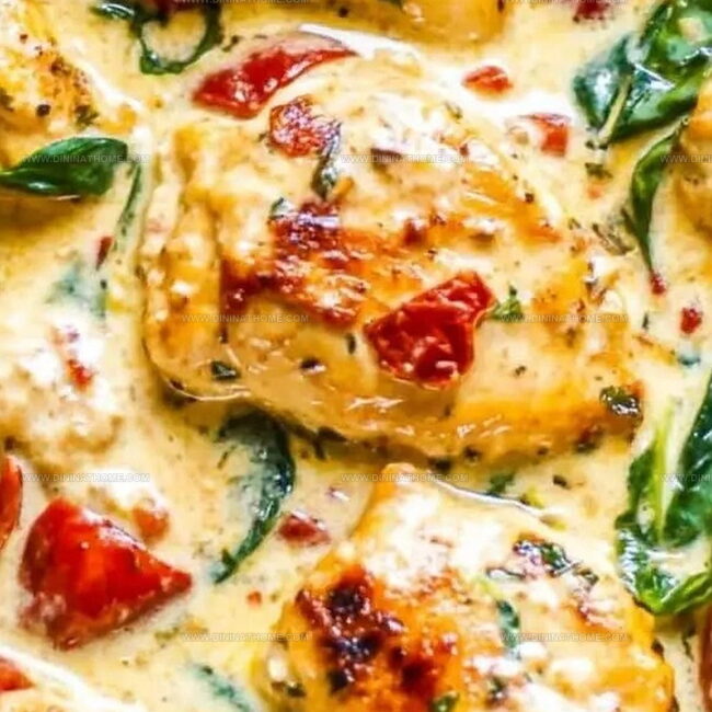 Succulent chicken bathes in a rich, herb-infused cream sauce inspired by Tuscany’s rustic kitchens. Silky textures and bold Mediterranean flavors invite you to savor each luxurious bite of this comforting culinary journey.