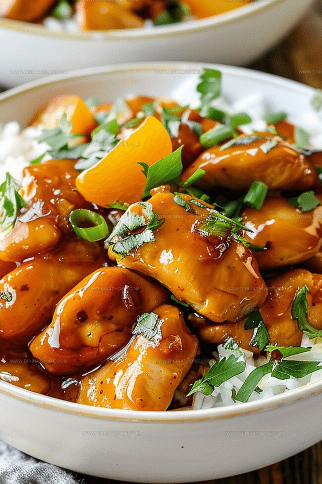 Succulent chicken pieces dance with vibrant apricot glaze, creating a symphony of sweet and savory notes.
