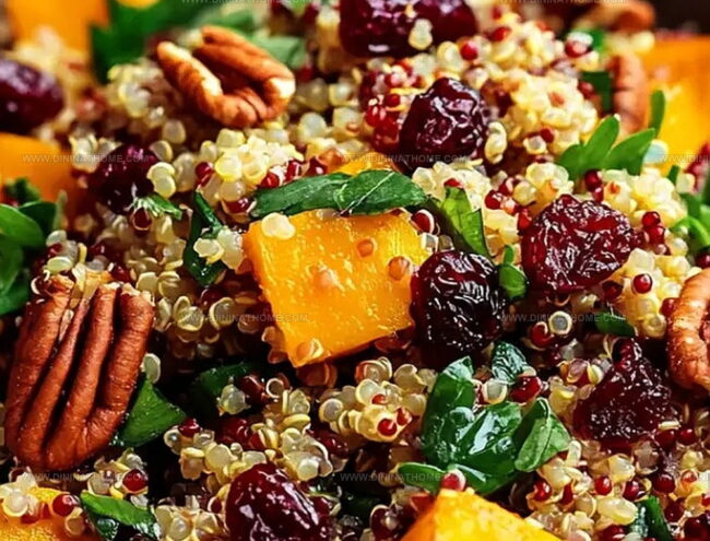 This salad is incredibly nutrient-dense, offering a balanced mix of protein from quinoa, healthy fats from pecans and olive oil, vitamins from pumpkin and spinach, and antioxidants from cranberries and pumpkin seeds.