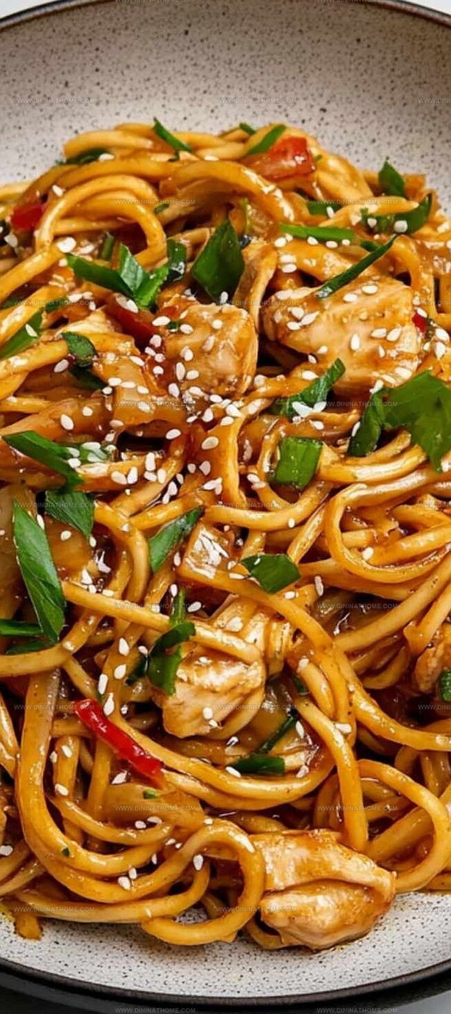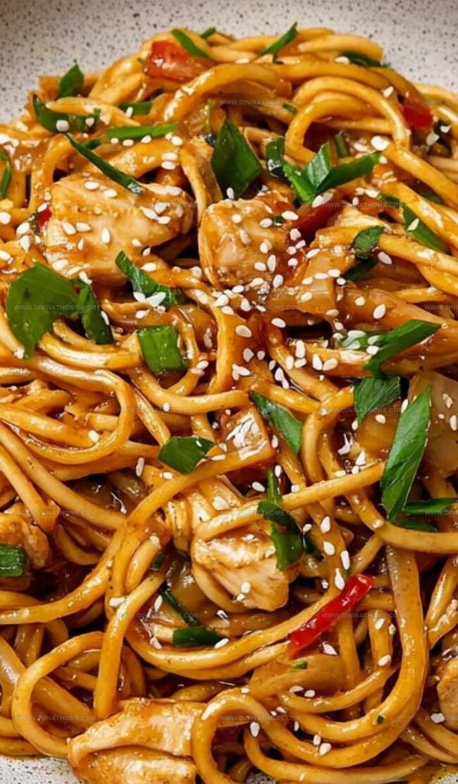 Tender chicken pieces nestle among glossy noodles, creating a meal that feels both indulgent and effortless.