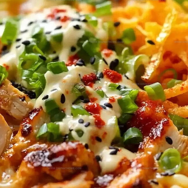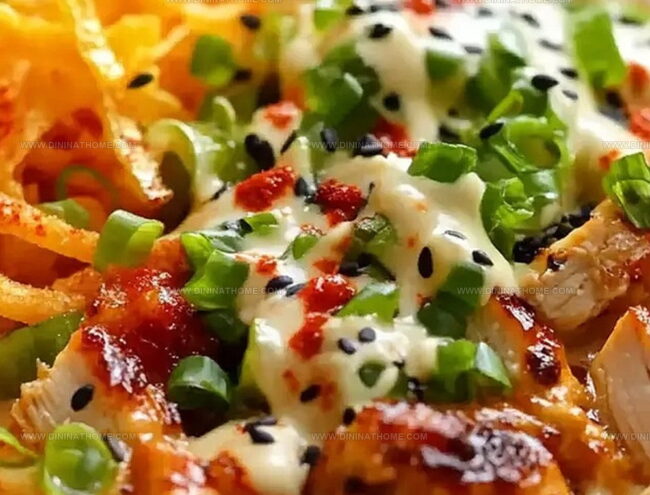 Crown with caramelized chicken and generously drizzle the creamy chili sauce.