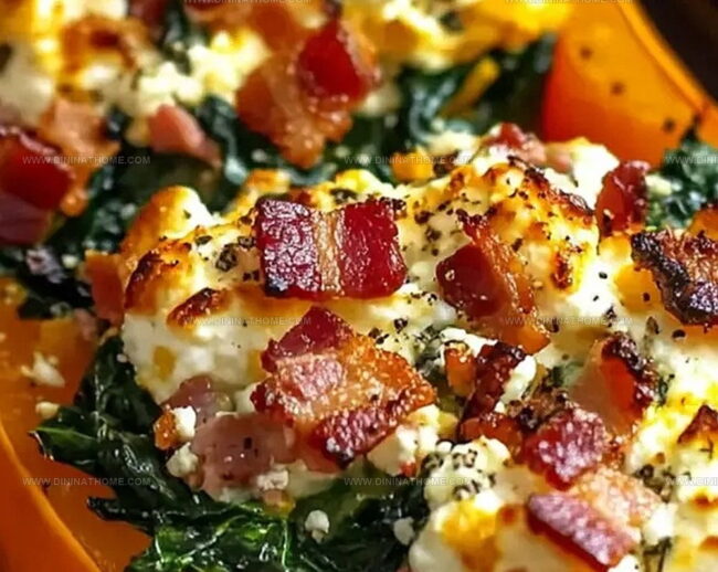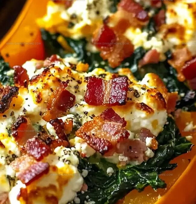 Generously fill each squash half with the spinach, bacon, and feta mixture.