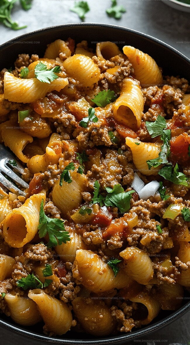 Layers of spicy ground beef mingle with tender pasta shells, creating a culinary adventure.
