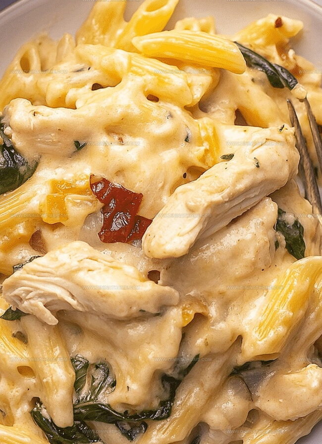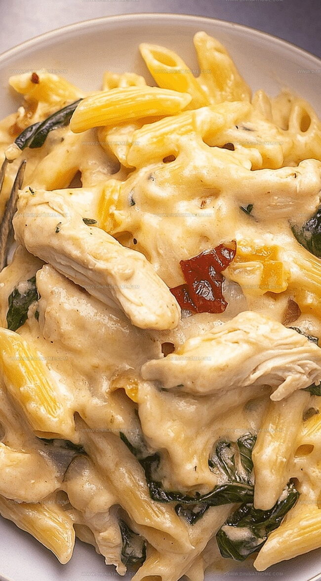 - Fold in the perfectly cooked pasta, transforming it with tender shredded chicken, vibrant sun-dried tomatoes, and fresh spinach leaves, ensuring every ingredient is lovingly coated.