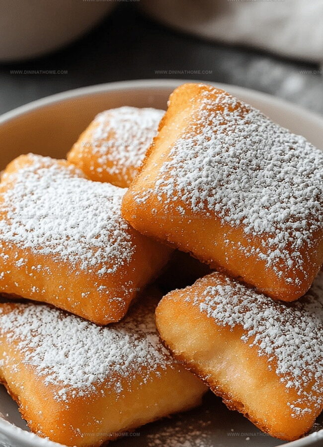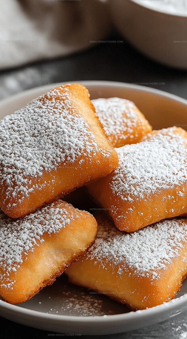 Silky smooth French beignets dance with powdered sugar, creating a delicate New Orleans-inspired treat. Sweet pillowy pastries melt in your mouth, whisking you straight to the charming streets of Louisiana with each delightful bite.