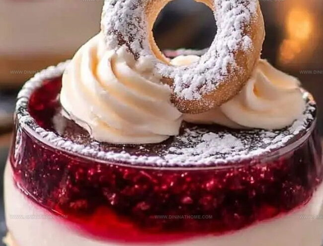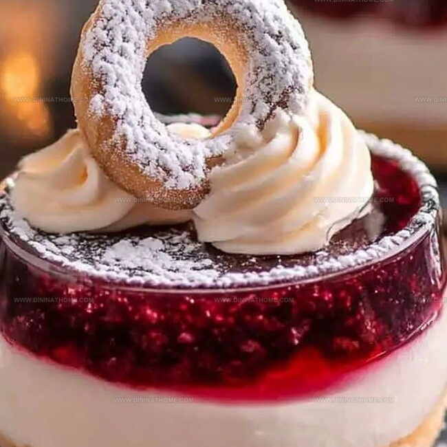 - Add a generous layer of vibrant cherry compote, allowing its rich color and fruity essence to peek through the creamy white surface.