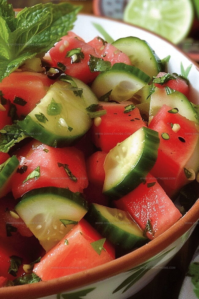 Juicy watermelon chunks dance alongside crisp cucumber slices in a light, zesty composition.